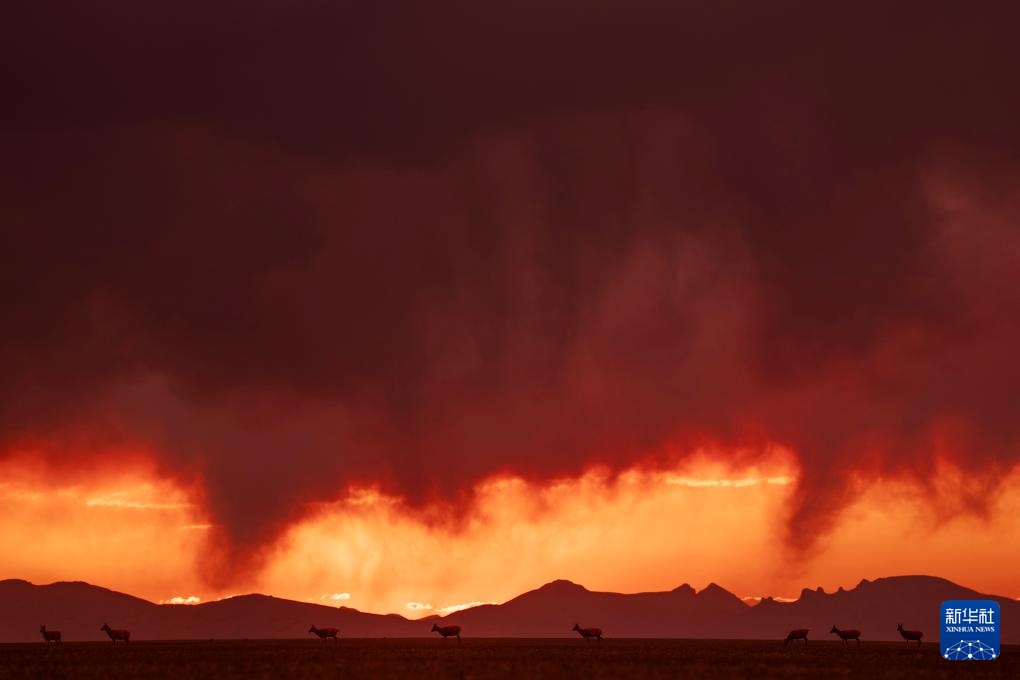 晚霞中魯確塘草原上待產(chǎn)的藏羚羊(6月16日攝)。新華社記者 費茂華 攝
