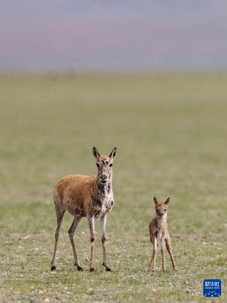 魯確塘草原上的藏羚羊母子(6月16日攝)。新華社記者 晉美多吉 攝??