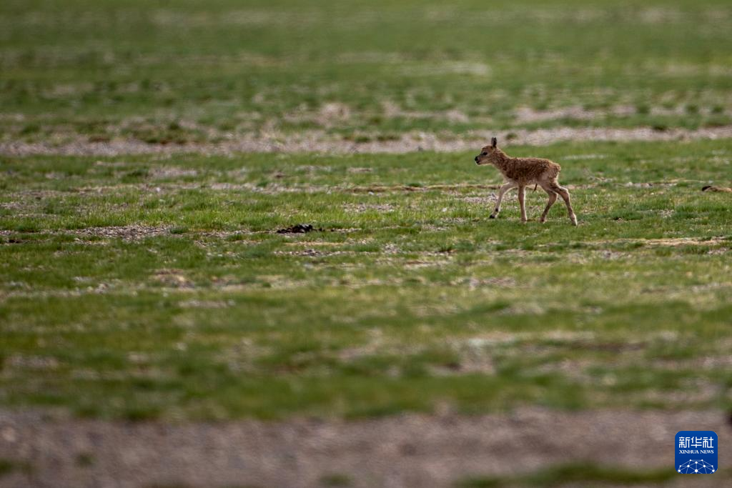 6月17日,在魯確塘草原,一只剛出生不久的小藏羚羊在草地上奔跑。新華社記者 費茂華 攝??