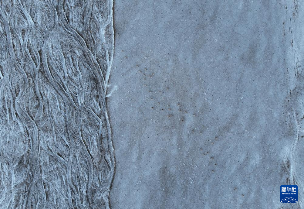 在甜水河畔荒灘雪地中向產(chǎn)羔地遷徙的藏羚羊(6月14日攝,無(wú)人機(jī)照片)。新華社記者 普布次仁 攝