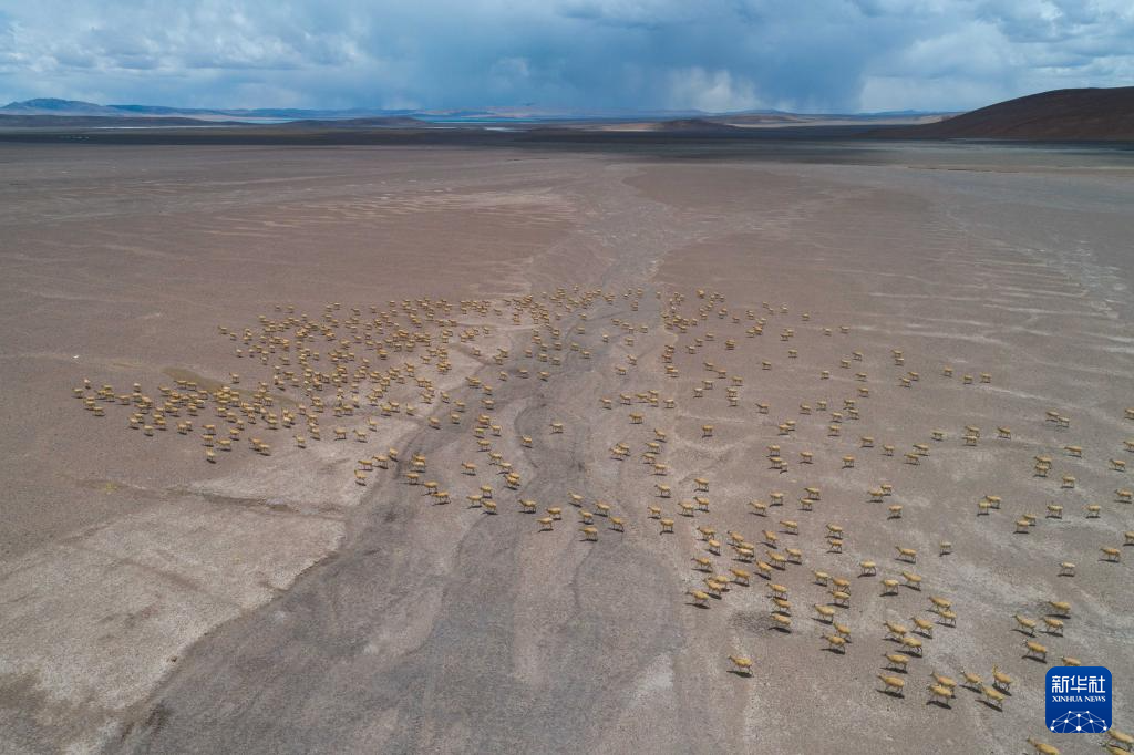 遷徙途中的藏羚羊(6月13日攝,無(wú)人機(jī)照片)。新華社記者 旦增尼瑪曲珠 攝