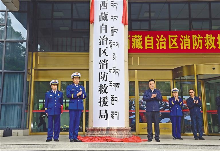 6月18日上午,自治區(qū)黨委書記王君正前往自治區(qū)消防救援總隊調研。這是王君正為西藏自治區(qū)消防救援局揭牌。本報記者 旦增西旦 攝