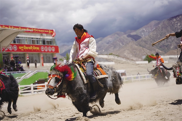 此時,賽場另一邊傳來歡呼,循聲望去,原來是本屆運動會的賽牦牛正在進(jìn)行。雖然牦牛生性溫和,但讓它們聽命令奔跑,也并不容易。記者了解到,參加本屆運動會的牦牛均由主人精挑細(xì)選,主人一聲吹哨,輕微地蹬腳,牦牛就會按指令向前行進(jìn),顯得默契十足。但偶爾也會發(fā)生小狀況,比如牦牛分不清方向擠成一團(tuán),跑著跑著就停頓休息,或者原路返回等,引得觀眾頻頻發(fā)笑。