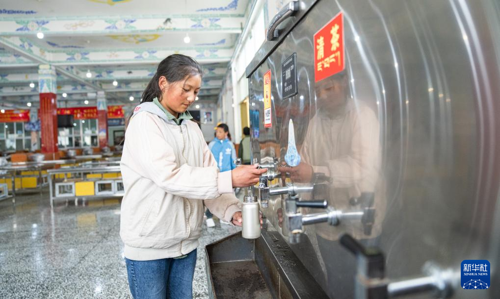 班戈縣中石化小學(xué)學(xué)生旺青拉姆用水杯接清茶(6月22日攝)。新華社記者 丁增尼達(dá) 攝