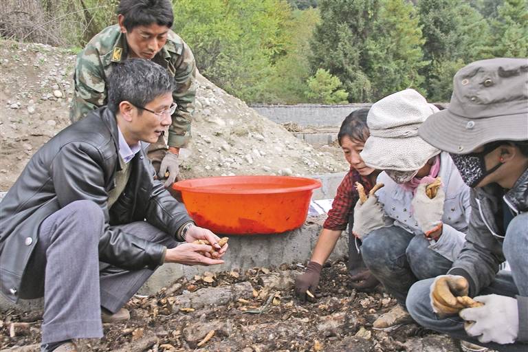 廣東省第七批援藏工作隊成員肖國鑫(左一)在波密縣指導當?shù)剞r牧民種植天麻。