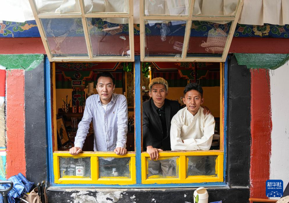 咖啡店三名年輕合伙人旦增特覺(jué)(右)、旦增格桑(中)和扎西多吉合影(7月5日攝)。新華社記者 晉美多吉 攝