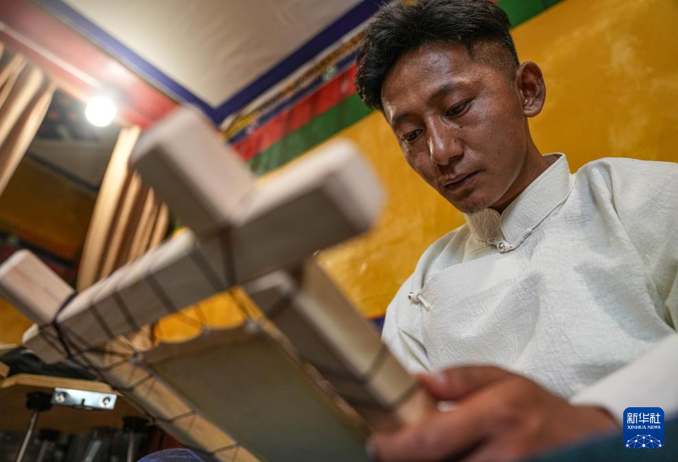 旦增特覺(jué)在店內(nèi)繪畫(huà)(7月5日攝)。他曾是一名唐卡畫(huà)師。新華社記者 晉美多吉 攝