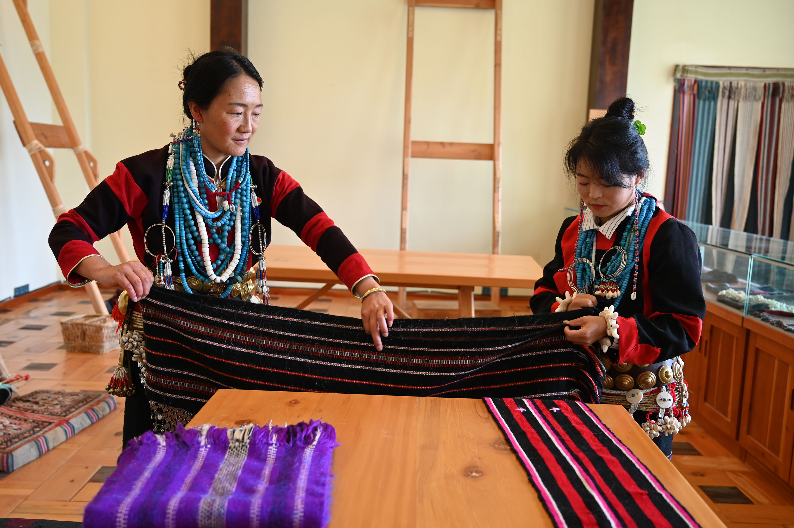 41歲的亞達兒不僅是才召村的婦聯(lián)主席,也是村里有名的黨員致富帶頭人。2007年,亞達兒開始向珞巴織布非遺傳承人亞依學習織布技藝。2014年,在相關部門的扶持下,米林珞巴族織布服飾加工傳習所在才召村成立,并聘請珞巴手工藝人亞依擔任教師,組織村里的年輕婦女進行系統(tǒng)學習。