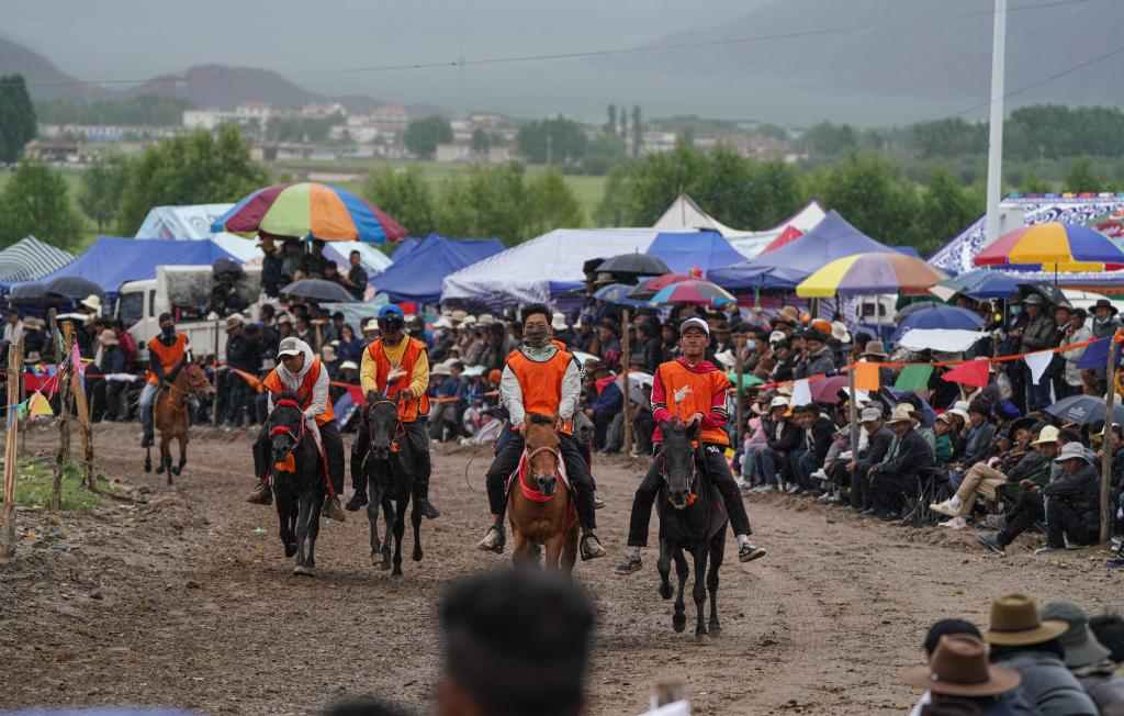 23日,在拉薩林周縣甘旦曲果鎮(zhèn)江角村的賽馬場(chǎng)上,選手邊瑪益丹穿著輕便的馬術(shù)運(yùn)動(dòng)服,上身貼緊棕色馬背,右手的馬鞭在空中打著旋,和他的愛(ài)馬進(jìn)行最后沖刺。