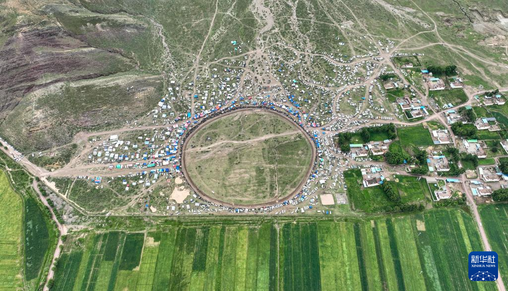 7月23日拍攝的拉薩甘丹曲果鎮(zhèn)賽馬場(chǎng)上的走馬比賽(無(wú)人機(jī)照片)。 新華社記者 晉美多吉 攝