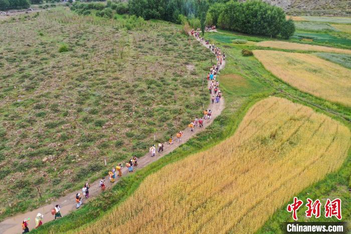 7月24日,西藏拉薩市曲水縣南木村迎來(lái)了一年一度的“望果節(jié)”。當(dāng)日,村民們盛裝打扮背上經(jīng)文,圍繞全村田園轉(zhuǎn)上一圈,轉(zhuǎn)到每一塊農(nóng)田前都要煨桑祈求風(fēng)調(diào)雨順、五谷豐登?!巴?jié)”民俗已有1500多年的歷史,是國(guó)家級(jí)非物質(zhì)文化遺產(chǎn)。圖為曲水縣南木村村民身著盛裝背上經(jīng)文繞田。(無(wú)人機(jī)照片)中新社記者 貢嘎來(lái)松 攝