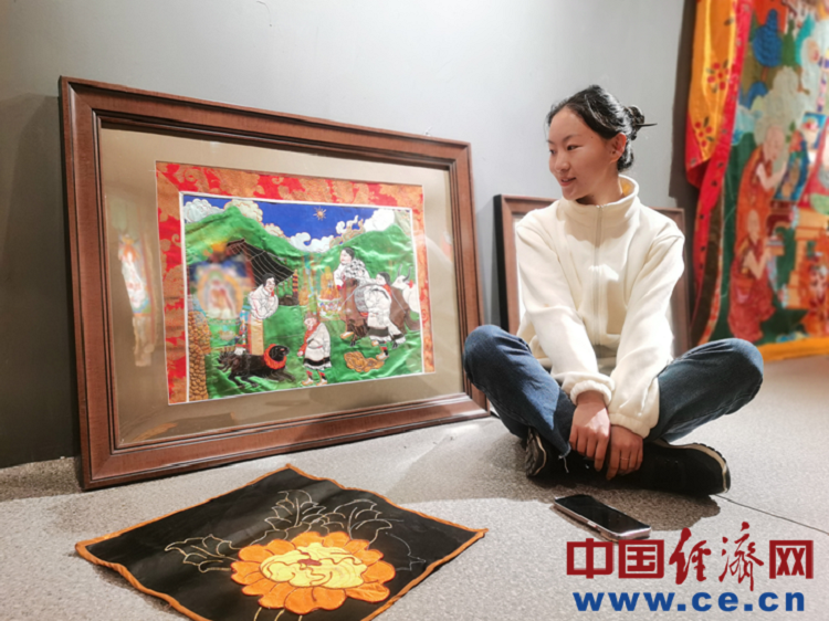 圖為巴桑德吉和她的《羌塘牧區(qū)圖》堆繡裝飾畫。 中國經(jīng)濟(jì)網(wǎng)記者魏金金/攝