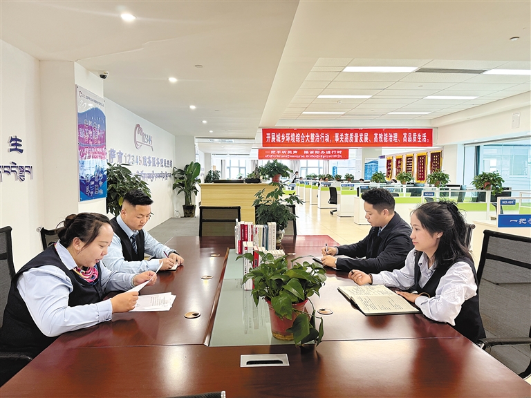 圖為拉薩市行政審批和便民服務(wù)局工作人員對12345疑難工單進行討論。記者 盧文靜 攝