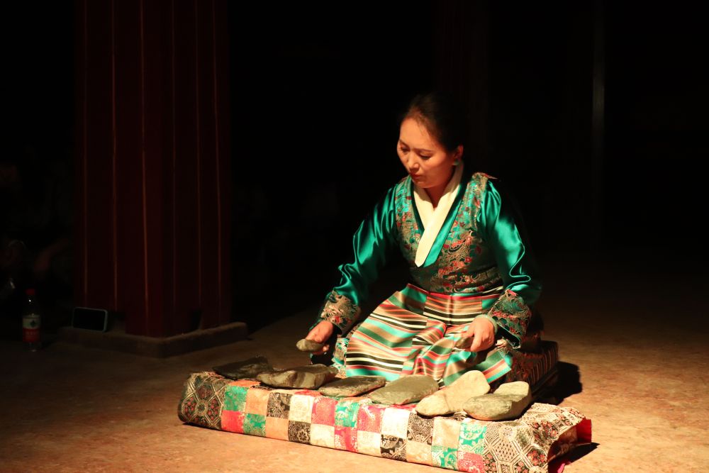 石琴使用天然的石塊作為伴奏樂(lè)器,從遠(yuǎn)古開(kāi)始就在高原上被人演繹。演奏者手持兩塊小石頭,跪坐在幾塊類似琴鍵的大石頭前,大小石頭在不同位置碰撞出不同的音高,演奏者按一定音階順序?qū)⑹^排列在琴架上,演奏出悅耳的旋律。