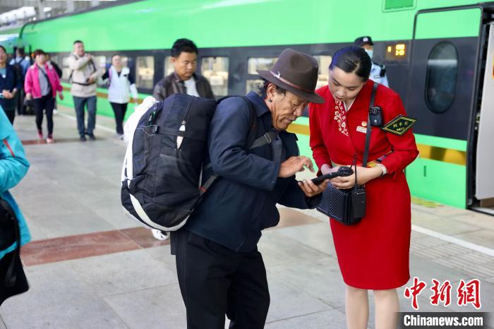 圖為拉日鐵路列車(chē)乘務(wù)員服務(wù)藏族旅客。資料圖 馬生明 攝