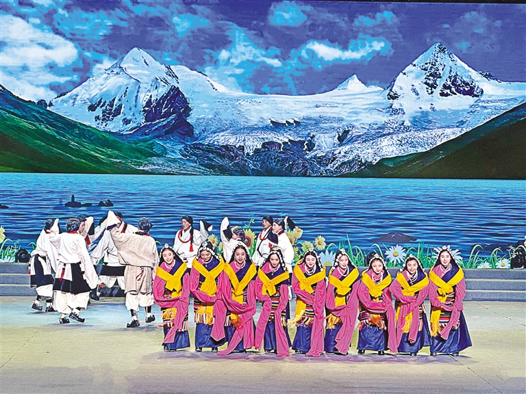 圖為班戈縣群眾在那曲市11縣區(qū)文藝調(diào)演比賽中表演舞蹈。
