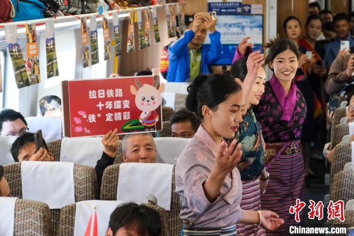 8月16日,西藏拉日鐵路通車十周年。作為連接拉薩與日喀則間的高原城際鐵路,十年來,拉日鐵路運送旅客超1429萬人次,運送貨物超524萬噸。圖為16日,中國鐵路青藏集團(tuán)有限公司職工在C885次動車組列車上表演鍋莊舞,與乘客共同慶祝拉日鐵路通車十周年。中新社記者 江飛波 攝