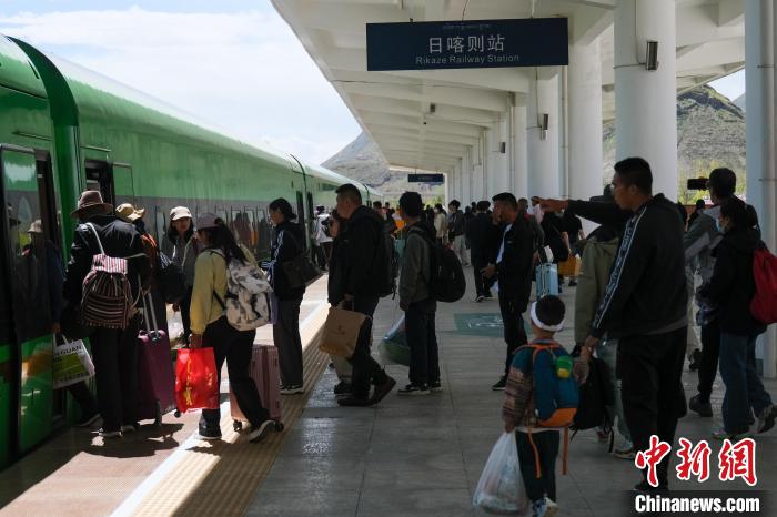 8月16日,西藏拉日鐵路通車十周年。作為連接拉薩與日喀則間的高原城際鐵路,十年來,拉日鐵路運送旅客超1429萬人次,運送貨物超524萬噸。圖為16日下午,乘客在拉日鐵路日喀則站搭乘C888次高原復(fù)興號動車組前往拉薩。中新社記者 江飛波 攝