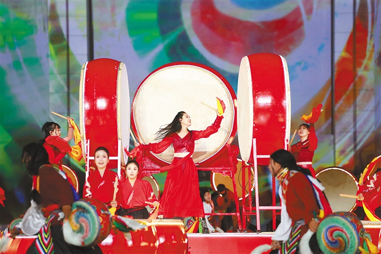 共振共鳴中國鼓,交流交融民族情。在激昂的鼓聲和大開大合的舞姿中,開幕式序曲《大江之鼓》緩緩呈現(xiàn)在所有人面前。喆友打擊樂團(tuán)、山南市瓊結(jié)久河卓舞隊(duì)等隊(duì)伍的近70名鼓手同臺獻(xiàn)藝、默契配合,讓鼓聲共振、情感共鳴,展現(xiàn)了激情洋溢、魅力無限的中華鼓文化。