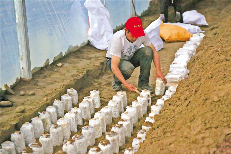 米林市米林鎮(zhèn)紅太陽(yáng)家庭示范農(nóng)場(chǎng)的工人在埋植林芝靈芝的三級(jí)菌包。記者 謝筱純 攝