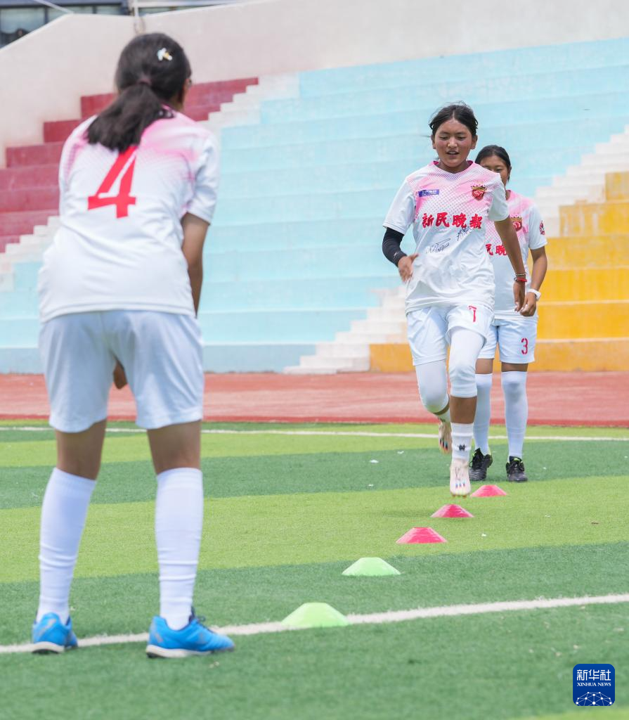 在西藏日喀則市上海實(shí)驗(yàn)學(xué)校,“珠峰雪鷹”女子足球隊(duì)隊(duì)員們?cè)诓賵?chǎng)上訓(xùn)練(9月3日攝)。新華社記者 丁汀 攝