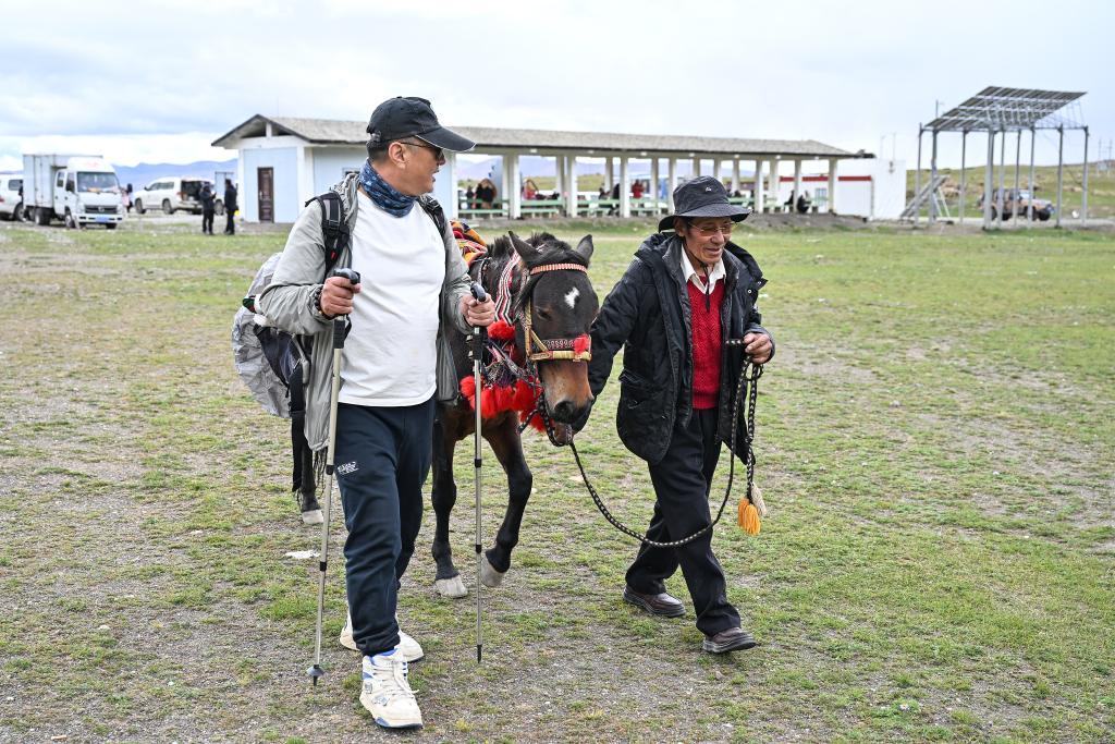 9月8日,在普蘭縣巴嘎鄉(xiāng)崗莎村,當(dāng)?shù)卮迕裾隣恐R和游客同行。新華社記者孫瑞博 攝