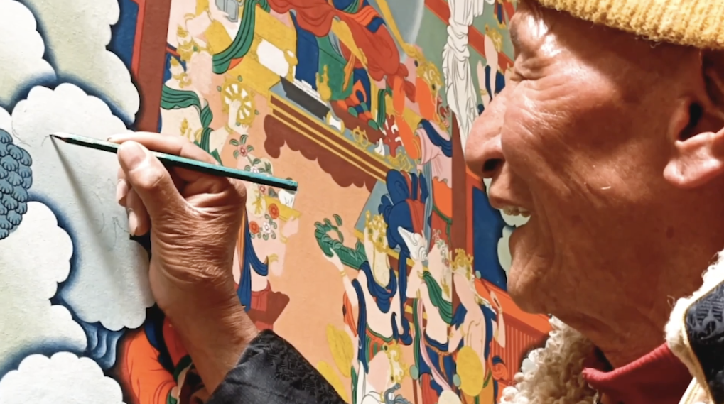 今年92歲高齡的嘎瑪?shù)吕绽先耍翘瓶ǜ卢敻鲁喈?huà)派第十代傳承人,曾被西藏自治區(qū)授予“唐卡藝術(shù)大師”等稱號(hào)。