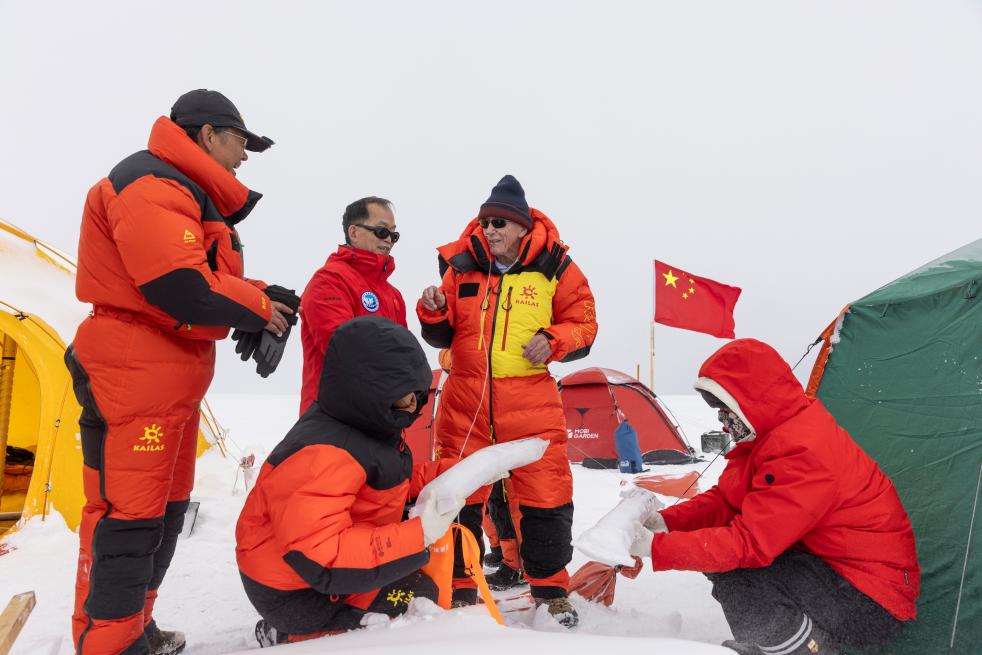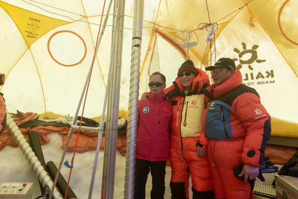 姚檀棟(左一)、湯普森(左二)在普若崗日冰原10號冰川冰穹C作業(yè)點工作帳篷內與冰芯鉆取工作負責人徐柏青研究員合影。新華社記者姜帆 攝
