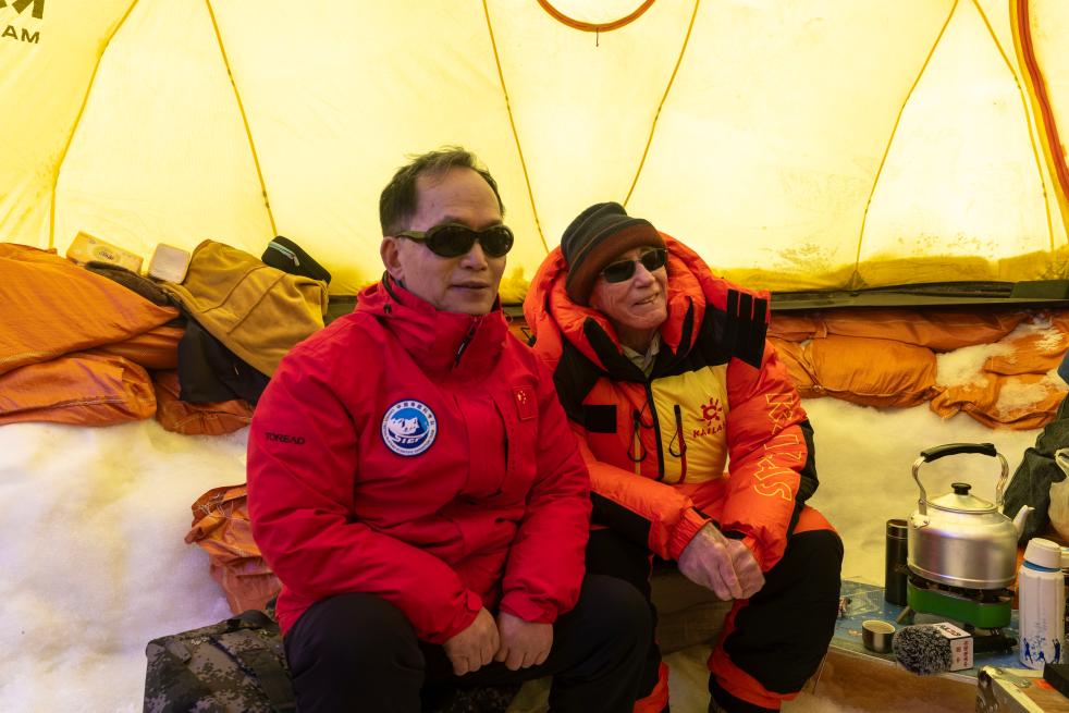 姚檀棟(左)、湯普森在普若崗日冰原10號冰川冰穹C作業(yè)點工作帳篷內查看作業(yè)情況時合影。新華社記者姜帆 攝