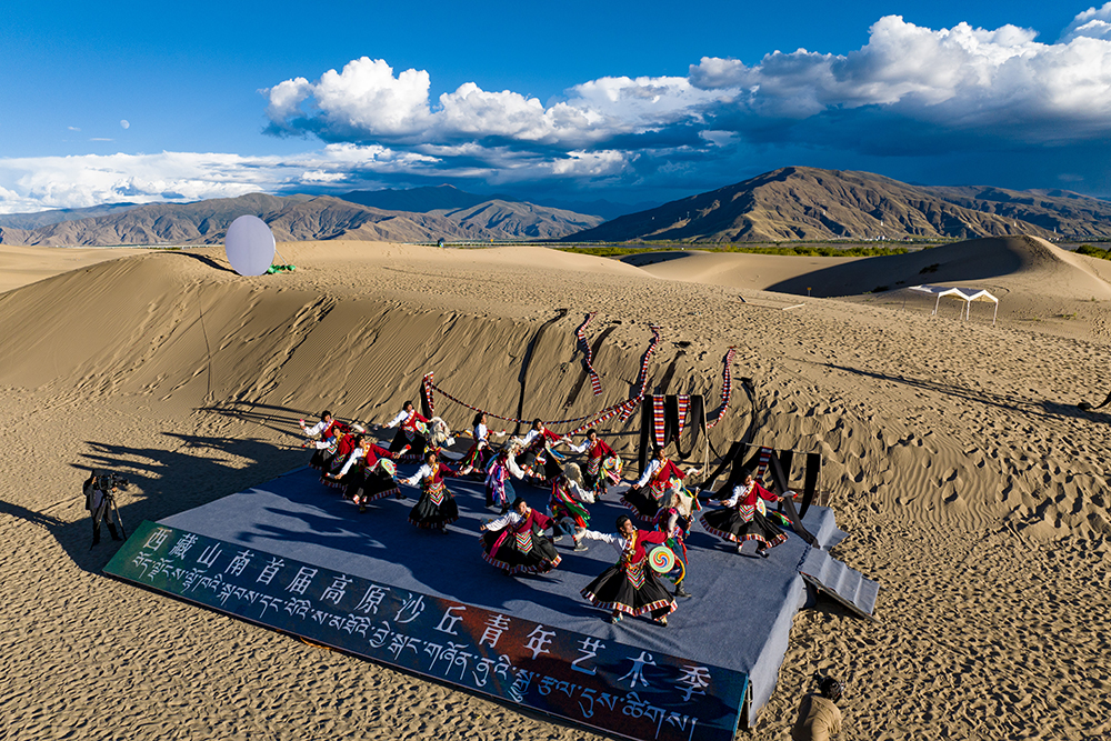 西藏山南首屆“高原沙丘青年藝術(shù)季”非遺歌舞展演現(xiàn)場(無人機(jī)照片,9月15日攝)。新華網(wǎng) 旦增努布 攝