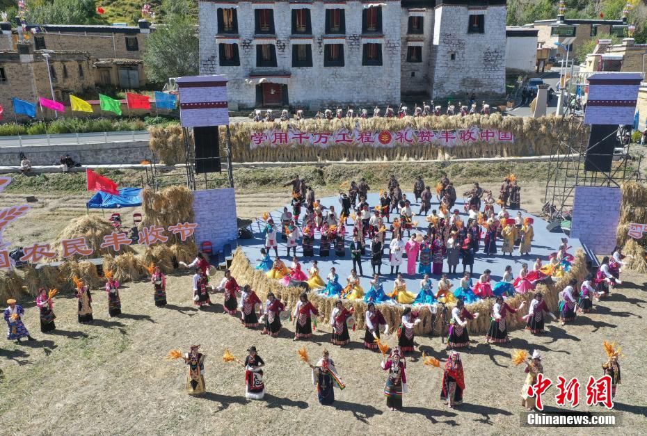 9月22日,2024年西藏“中國農(nóng)民豐收節(jié)”慶?;顒釉谏侥鲜协偨Y(jié)縣拉玉鄉(xiāng)強吉村舉行?;顒右浴皩W(xué)用‘千萬工程’禮贊豐收中國”為主題,由西藏各地(市)民間演出隊為大家獻上一場具有地域特色、體現(xiàn)農(nóng)牧民豐收喜悅的歌舞盛宴。圖為演出現(xiàn)場。(無人機照片)