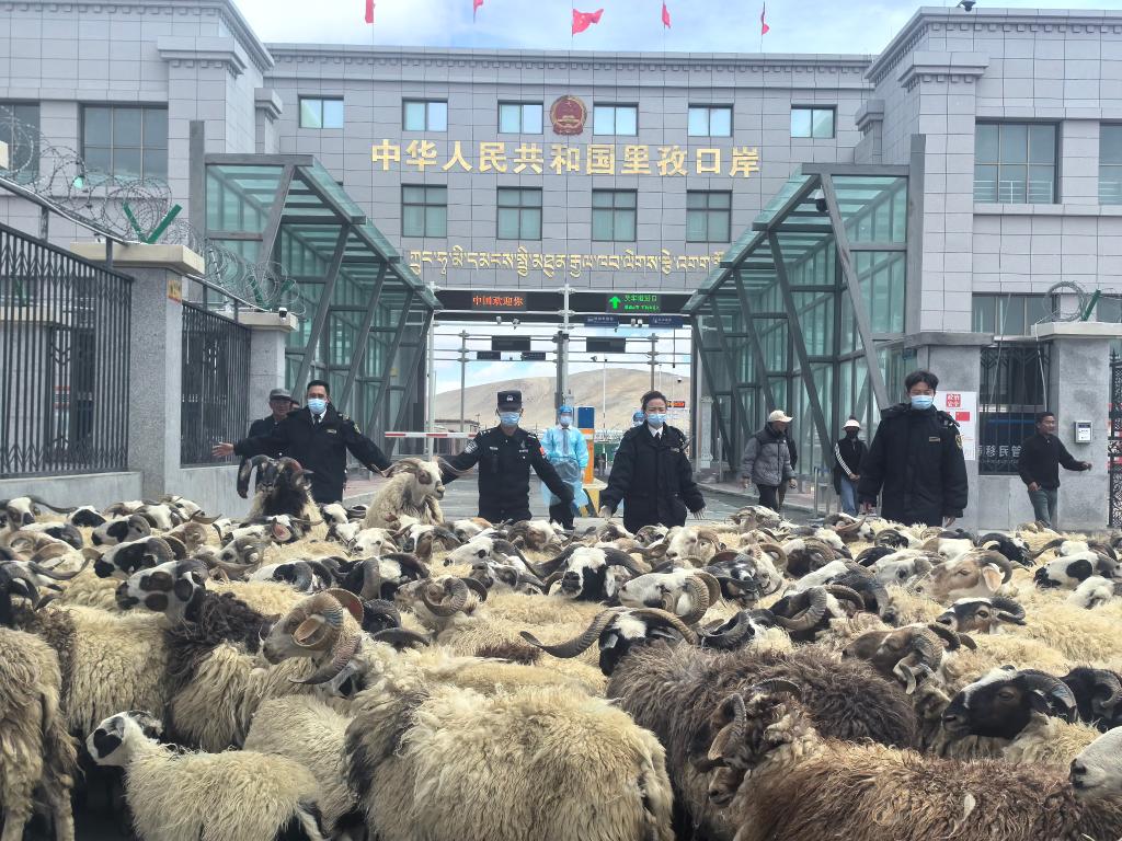 日喀則海關(guān)工作人員在里孜口岸監(jiān)管活羊出口。(受訪者供圖)