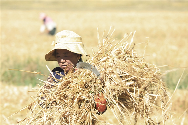 金秋九月,風(fēng)吹麥浪、穗粒飽滿,連日來,在墨竹工卡縣金黃色的農(nóng)田里,處處可見勤勞的農(nóng)民們搶抓時(shí)機(jī),開展小油菜和青稞收割、晾曬、搬運(yùn)、儲(chǔ)藏,確保糧食顆粒歸倉。