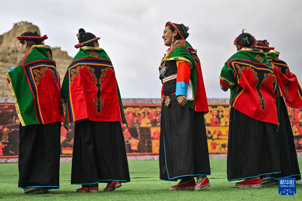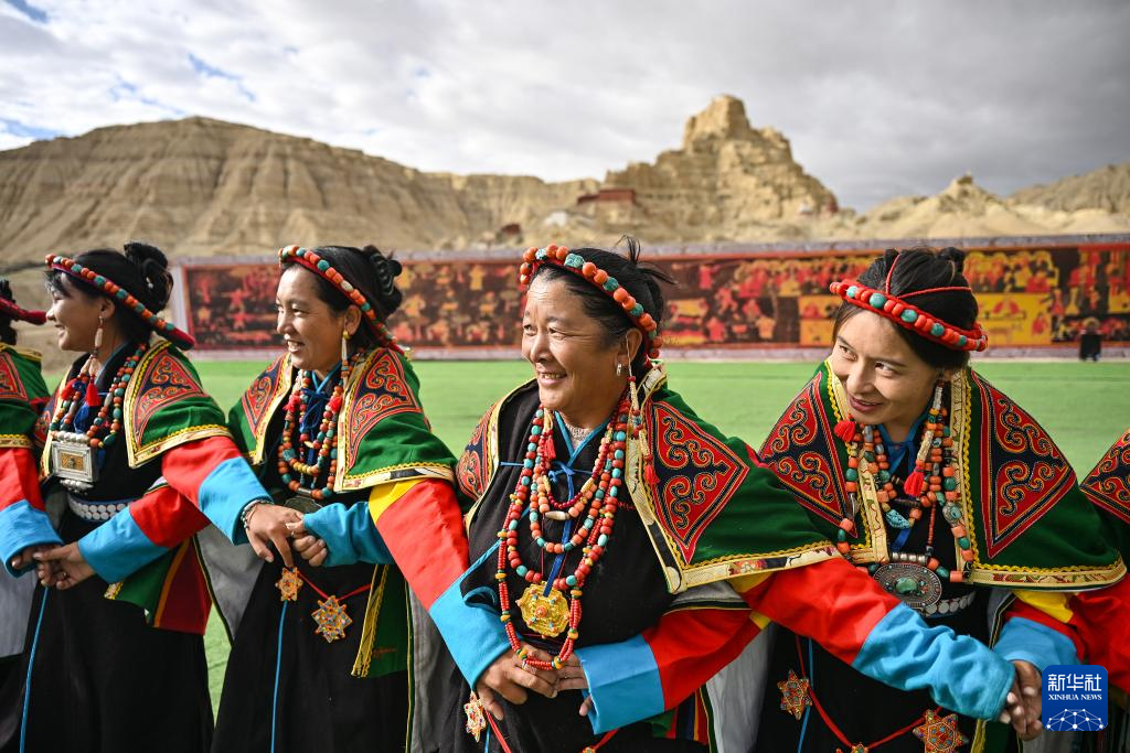 在西藏阿里地區(qū)札達(dá)縣古格王國遺址腳下,當(dāng)?shù)卮迕癖硌荨靶琛焙蠡ハ嘟涣鳎?月11日攝)。新華社記者 孫瑞博 攝