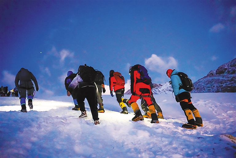 徒步至海拔5500米左右時,坡度變陡,需要借助上升器向上攀登。此時,自治區(qū)登山隊的向導們早已在路線上固定好了安全繩,每隔100米打一個錨點,并安排人員守護在一旁,幫助山友們依次掛好主鎖,固定好上升器。“大家一定要按照自己的節(jié)奏,踩著前人的腳印慢慢往上爬,不要自己新踩腳印,會消耗體力。時間還很充足,大家注意分配好體力,最后都能登頂?!痹谂实沁^程中,自治區(qū)登山隊向導阿旺細心叮囑與鼓勵著從他面前經(jīng)過的人。