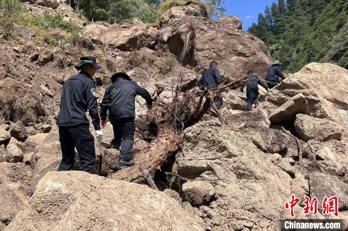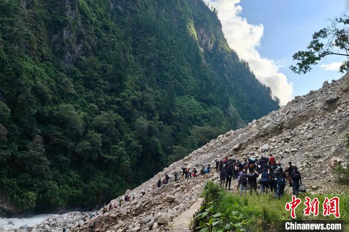 圖為吉隆出入境邊防檢查站民警帶領滯留尼籍邊民通過塌方路段前往吉隆口岸。郭章統(tǒng) 攝