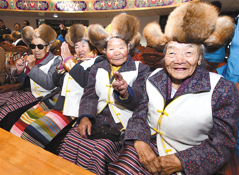 圖為拉薩市社會福利院的老人們圍坐在一起歡度重陽節(jié)。記者 唐斌 攝
