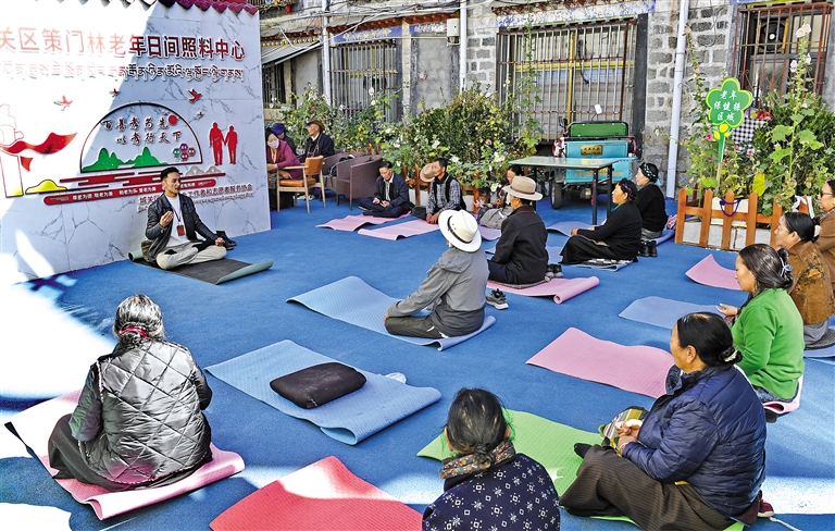 圖為拉薩市城關(guān)區(qū)策門林老年日間照料中心舉辦培訓,教老人們練習瑜伽。記者 旦增蘭澤 攝