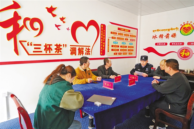 圖為帕里邊境派出所民警在“三杯茶”調(diào)解室調(diào)處矛盾糾紛。記者 張宇 通訊員 白瑪倉覺 攝
