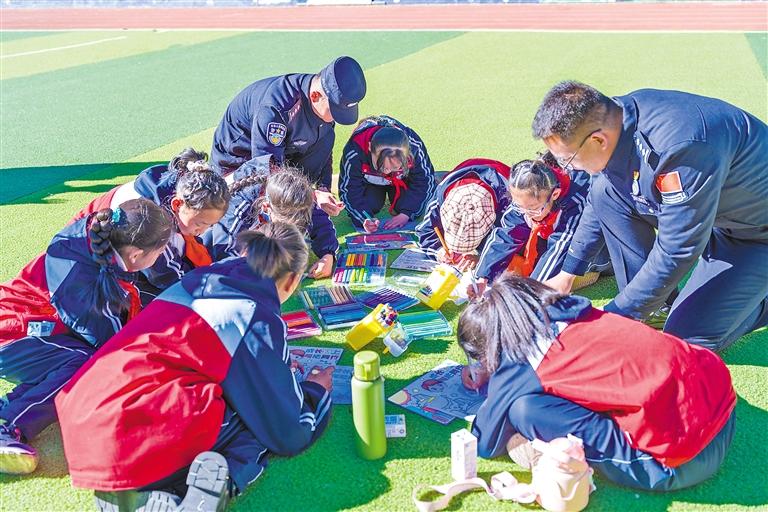 圖為亞東出入境邊防檢查站的民警和學(xué)生一同創(chuàng)作“憲法伴我成長”手抄報(bào)。通訊員 李錦輝 攝