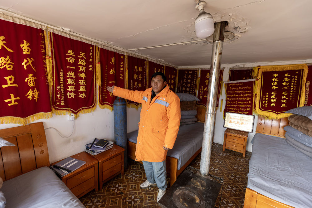 這里的救助站吸引了記者的注意。進(jìn)入房間,內(nèi)有床鋪、氧氣瓶、抗高反藥等物品,四面墻上掛滿錦旗。一封毛筆書寫的紅底感謝信格外顯眼,信中表達(dá)了對(duì)地嘎、東力、次仁多吉三名養(yǎng)路工人的感謝。信中寫道:“在那漫長(zhǎng)的10個(gè)小時(shí)里,你們不顧危險(xiǎn)和疲憊,想盡辦法讓我脫險(xiǎn)。”