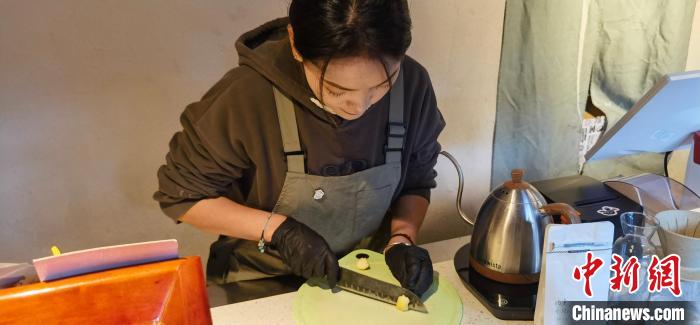12月14日,檸渡咖啡館的店員在切酥油,準備做“拉薩拿鐵”咖啡。中新社記者 趙凜松 攝
