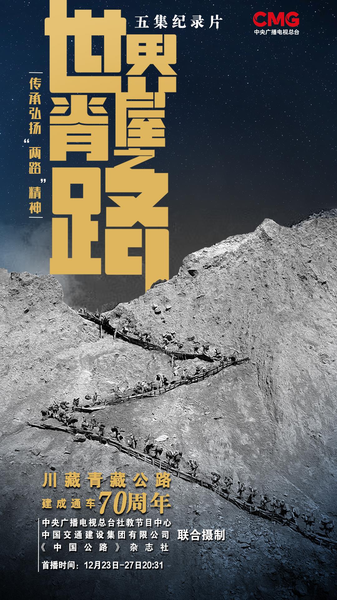 12月23日至27日,五集紀(jì)錄片《世界屋脊之路——川藏、青藏公路建成通車70周年》央視科教頻道(CCTV-10)每晚20:31播出。央視網(wǎng)、央視頻、央視科教新媒體矩陣同步播出。