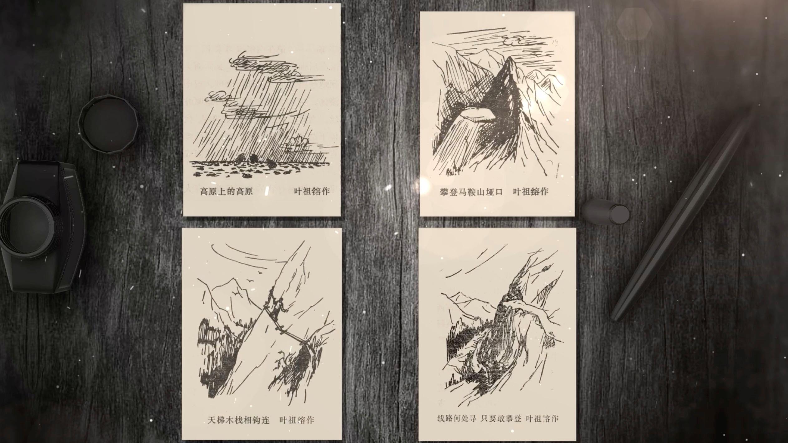 畫稿的作者是葉祖镕。他是踏勘隊(duì)中負(fù)責(zé)地形圖測(cè)繪的成員。在隊(duì)長(zhǎng)余炯帶領(lǐng)下,深入無人區(qū)進(jìn)行勘測(cè),與筑路大軍幾近失聯(lián)數(shù)月,但最終冒著生命危險(xiǎn)帶回了寶貴的勘測(cè)報(bào)告。這是葉祖镕當(dāng)年畫的素描畫,高原上的高原、雪山頂?shù)膱嚎凇⒔^壁間的天梯、險(xiǎn)峰中的窄路、踏勘隊(duì)沿途經(jīng)歷的各種地形,保留在這四張手繪中,它們見證著在生死之間,踏勘隊(duì)員的樂觀豁達(dá)、無所畏懼。