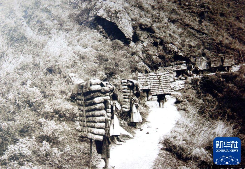 1903年茶馬古道上,背夫從四川瀘定背茶前往青藏高原。新華社發(fā)