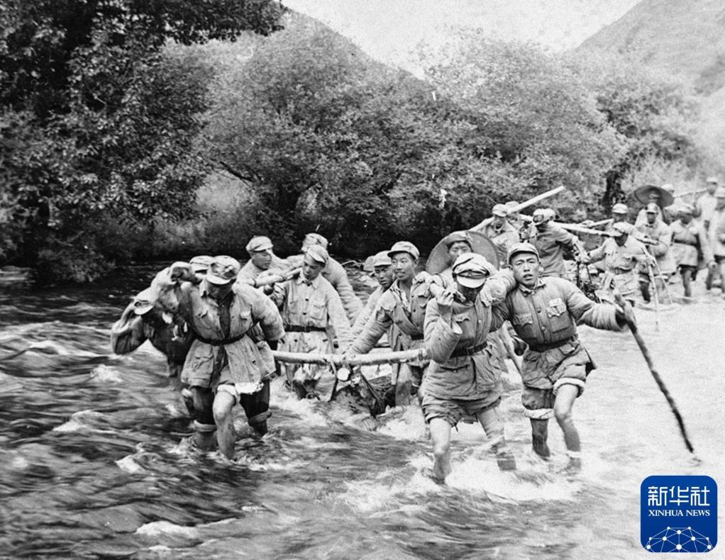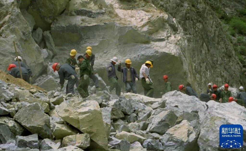 1950年,筑路大軍挺進西藏途中,官兵們在冰冷刺骨的河水中抬運石料。新華社發(fā)