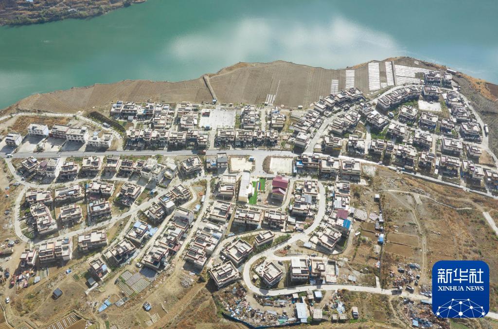 2019年4月16日,在川藏公路沿線的四川瀘定縣瀘橋鎮(zhèn)咱里村,移民新村面貌一新(無人機照片)。新華社記者 江宏景 攝