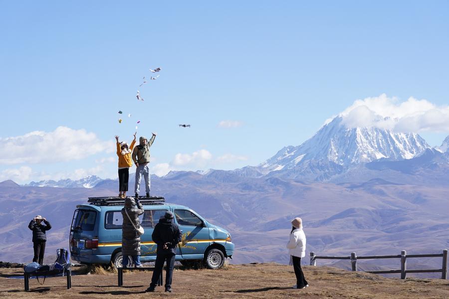 10月28日,游客在八郎生都觀景平臺拍照,后面是雅拉雪山。新華社記者 胥冰潔 攝