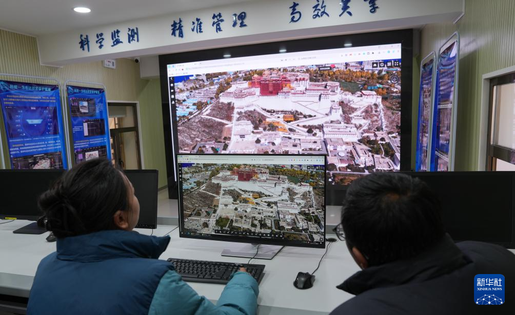 12月4日,布達(dá)拉宮監(jiān)測中心的工作人員在查看無人機(jī)拍攝的圖像。新華社記者 晉美多吉 攝