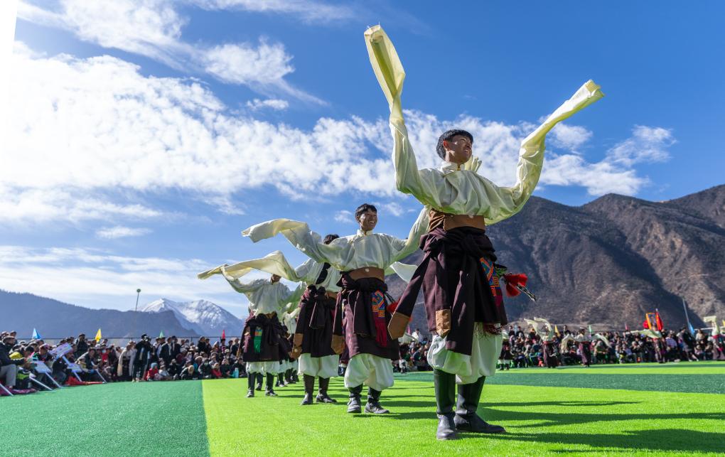 在馬利鎮(zhèn)“云中球場”,當?shù)厝罕娫谇蛸愰_幕式上表演舞蹈(1月2日攝)。新華社記者 丁增尼達 攝
